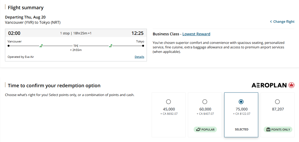 EVA Air from Vancouver to Tokyo (NRT) in their 777 and 787-10 in Business on August 20th, 2026 for 75,000 Points. Comparable cash fares going for around $5,000.