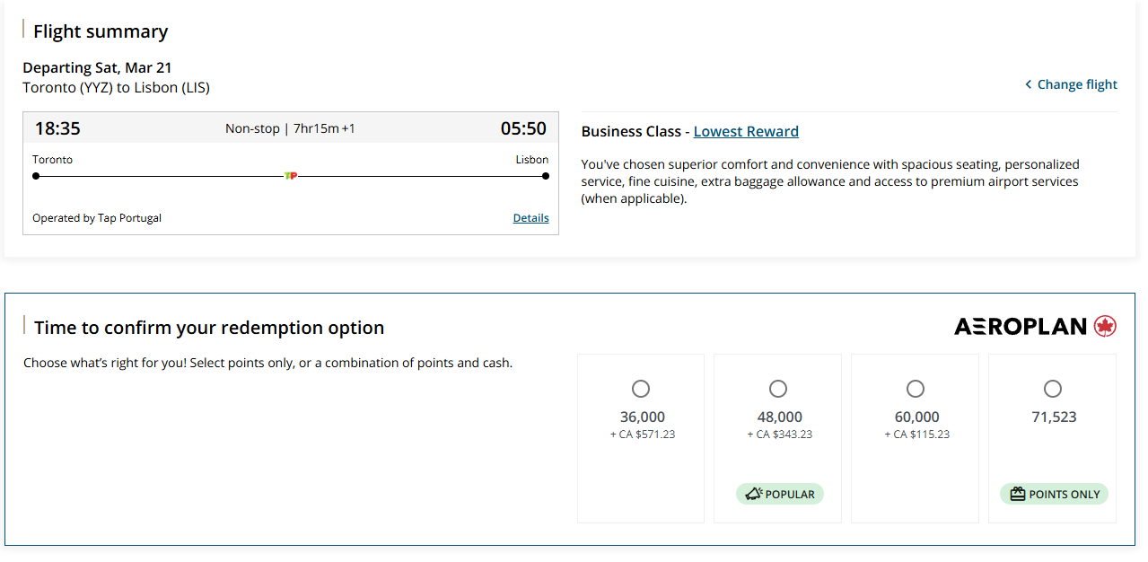 TAP Portugal on their A321 Neo with Full recliner seats for 60,000 points on March 21, 2026. Average cash value of $3,000 CAD.